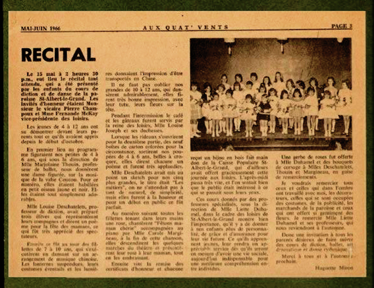 Mai-juin 1966 - Récital  préparé par : Mlle Louise   Deschâtelets, professeure de diction et de Mme Marjolaine Thouin, professeure de ballet.